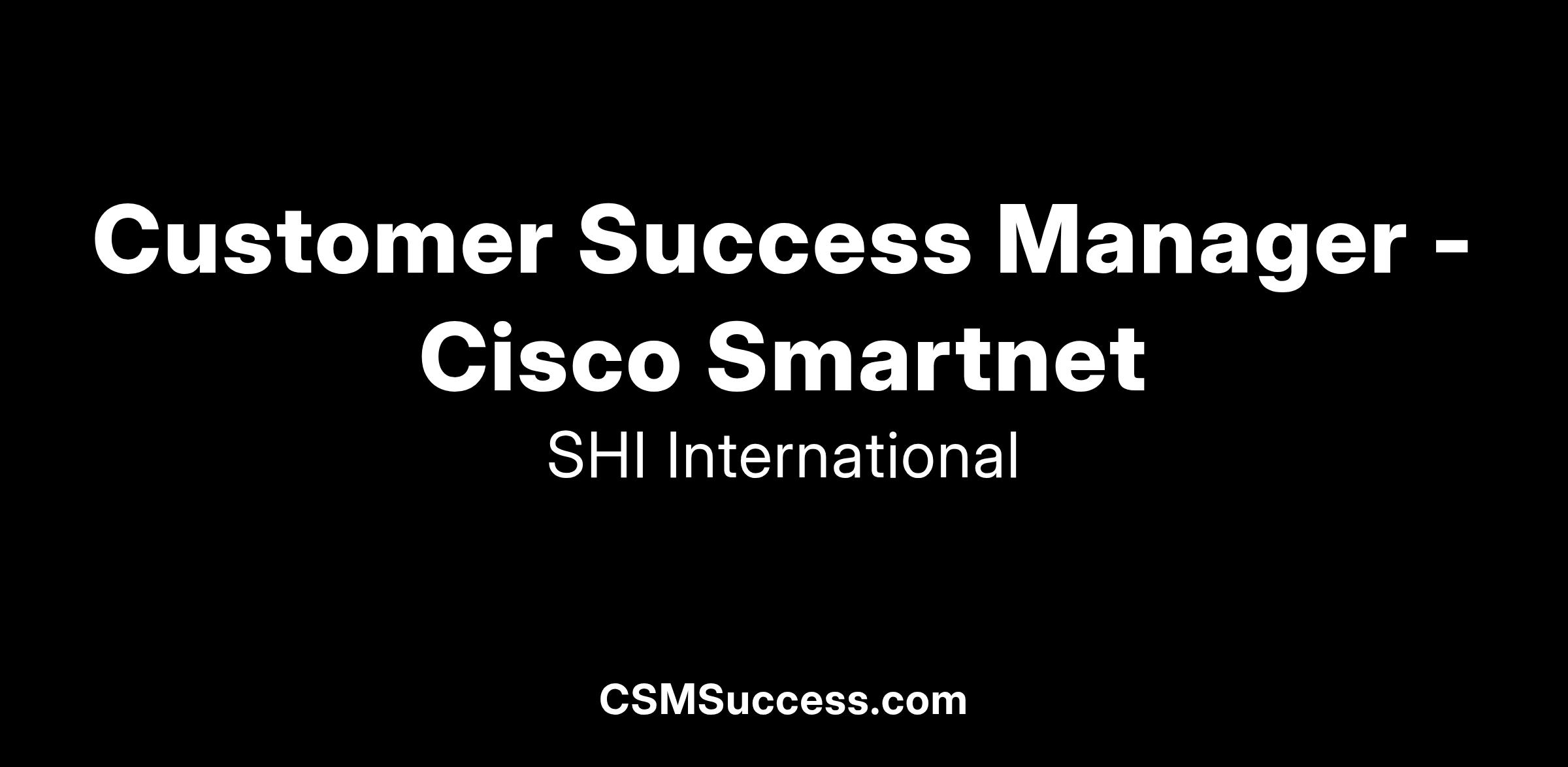 The Cisco Smartnet Customer Success Manager is responsible for retention and growth of SHI Cisco Smartnet business within a given region. The Success Manager will work closely with SHI sellers and build Cisco seller relationships as well as top customer relations inside the assigned coverage area. The Success Manager will meet with select customers each month, helping them with Cisco product road map, transition to the cloud, and ensuring a positive customer experience with SHI.